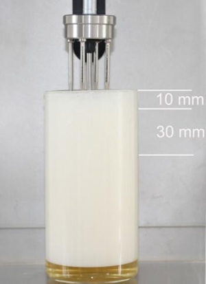 c)当泡沫消失到参考位置以下一个设定距离(10 mm)时,计时开始,当泡沫继续消失时,电极系统继续下移设定距离(例如30mm)所经历时间被记录下来,就是泡沫稳定性值。