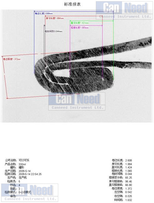 18)   可以保存和打印卷边图像和数据,方便与生产部门或制罐厂沟通,无需保留样罐;