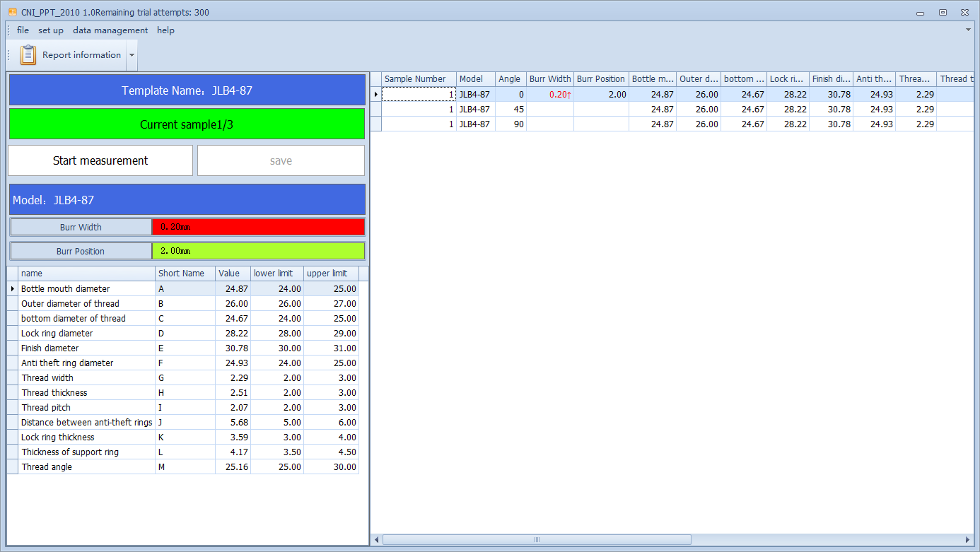 It uses a non-contact measurement method, which is more convenient and accurate. With one click, it can measure the size of the finishing, suitable for testing preform mouth with a height ≤ 30 mm and a diameter < 39 mm. It can also quickly change the bottle mouth positioning fixture during the production process to adapt to measurements of different bottle mouth diameters.